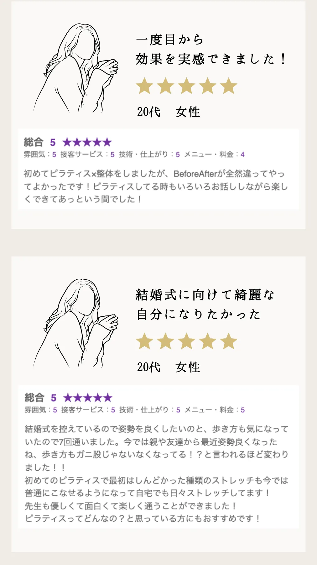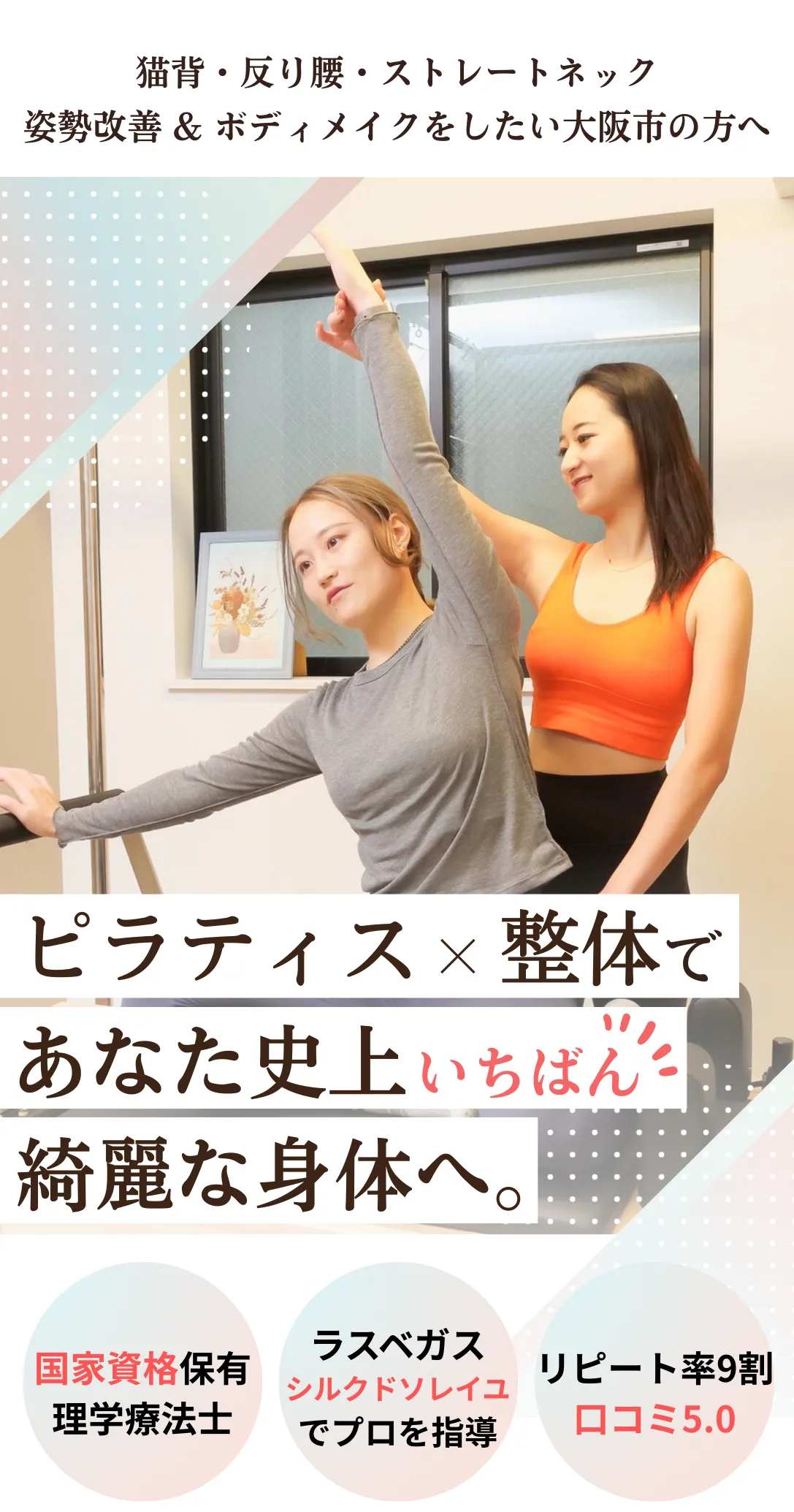 ピラティス・整体・ストレッチ・管理栄養士による食事指導までトータルでサポートするため、最短で理想の身体づくりを目指せます。