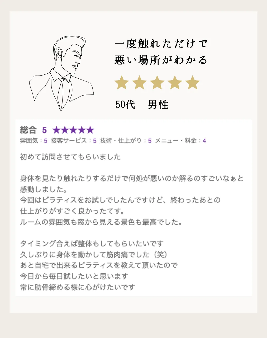 理学療法士があなたの身体を徹底分析。原因に合わせたオーダーメイドのピラティス整体で、たった1回でも変化を実感できます。
